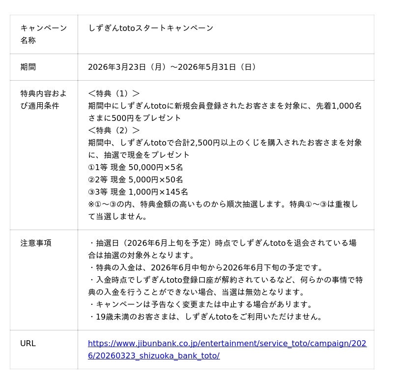 auじぶん銀行株式会社(本社:東京都中央区、代表取締役社長:田中 健二、以下 auじぶん銀行)は2026年3月23日から、株式会社静岡銀行(本社:静岡県静岡市、頭取:八木 稔)へ「提携金融機関向けtotoサービス Powered by じぶん銀行toto」(以下 本サービス)の提供を開始します。本サービス提供により、静岡銀行では、お客さま向けに「しずぎんtoto」を開始します。また、「しずぎんtoto」の開始を記念し、同日から静岡銀行の口座をお持ちの方向けにキャンペーンを実施します。