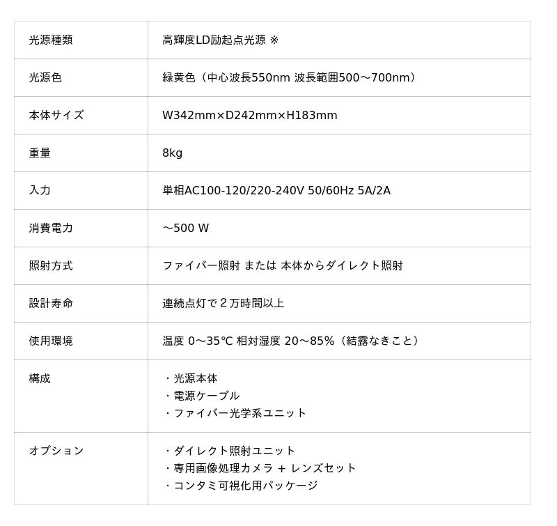 ※インラインでの透明体内部欠陥(ムラ・脈理)検査を目的とした、光ファイバー伝送による超指向性点光源装置として(2026年3月現在、当社調べ)
