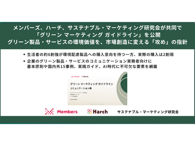 DX現場支援で顧客と共に社会変革をリードする株式会社メンバーズ(本社:東京都中央区、代表取締役社長:高野 明彦、東証プライム:2130、以下「メンバーズ」)は、ハーチ株式会社(本社:東京都港区、代表取締役:加藤 佑)、サステナブル・マーケティング研究会(リーダー:駒澤大学 経営学部 教授 青木 茂樹)と共同で、グリーン製品・サービスを適切かつ魅力的に社会に発信する指針や手法をまとめた、企業のコミュニケーション実務者向け「グリーン マーケティング ガイドライン」を公開したことをお知らせします(※1)。
