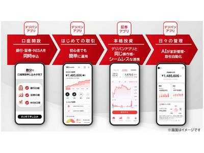 まず、お客さまは、デジタルバンクアプリにて、数分の簡単な操作で銀行口座と証券口座(NISA口座を含む)の同時申込が完了し、資産形成サービスをすぐに利用することができます。その後、新エンティティがデジタルバンクとともに提供するサービスにより、日々の家計および資産管理から資産運用まで、スマートフォンアプリ1つで完結します。操作はシンプルかつ直感的で、フリクションがないものとなります。