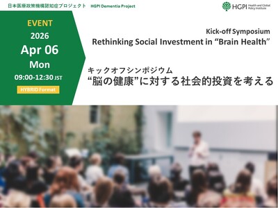 特定非営利活動法人 日本医療政策機構(HGPI: Health and Global Policy Institute)(所在地:東京都千代田区、代表理事:乗竹 亮治)は、2026年4月6日(月)に認知症プロジェクト2026年度キックオフシンポジウム「“脳の健康”に対する社会的投資を考える」を、対面(会場:帝国ホテル東京)とオンラインのハイブリッド形式で開催します。