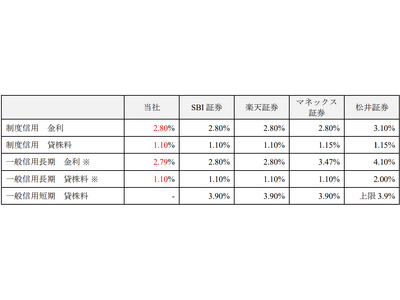 <信用取引における信用金利・貸株料他社比較(年率)>