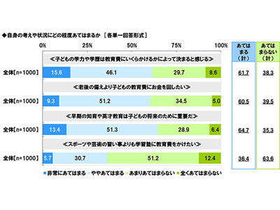 大学生以下の子どもがいる20歳以上の男女1,000名(全回答者)に、子どもの教育や教育費に関する内容について、自身の考えや状況がどの程度あてはまるか聞きました。