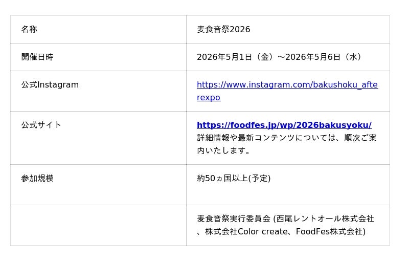 万博の閉幕後に開催する「麦食音祭2026 ~アフター万博~」としてコンセプトを継承しつつ、世界を日常のイベントに落とし込むことを目的としています。