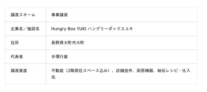 事業承継・M&Aマッチングプラットフォーム「TRANBI(トランビ)」を運営する株式会社トランビ(本社:東京都港区、代表取締役:高橋聡)は、長野県大町市で50年以上にわたり営業を続ける洋食店「Hungry Box YUKI(ハングリーボックスユキ)」(代表:手塚行雄)が、実名掲載の形で後継者募集を開始したことをお知らせいたします。