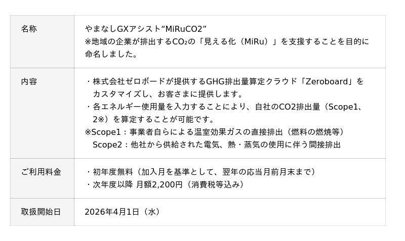 株式会社山梨中央銀行(頭取 古屋 賀章)は、地域企業の脱炭素経営を支援するため、CO2排出量算定ツール「やまなしGXアシスト“MiRuCO2”」の取扱いを開始します。