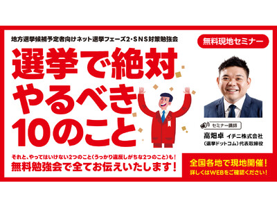 日本最大級の政治・選挙情報プラットフォーム「選挙ドットコム」を運営するイチニ株式会社(東京都渋谷区、代表取締役:高畑 卓)は、地方選挙候補予定者・関係者を対象に、実践的なネット選挙対策セミナーを2026年4月・5月に全国各地で開催します。
