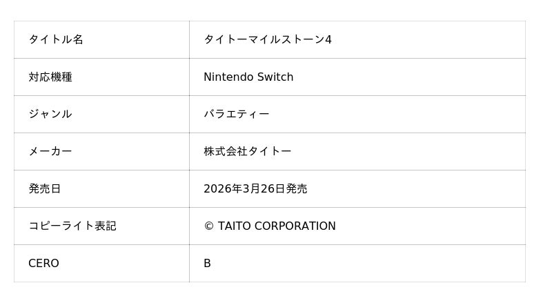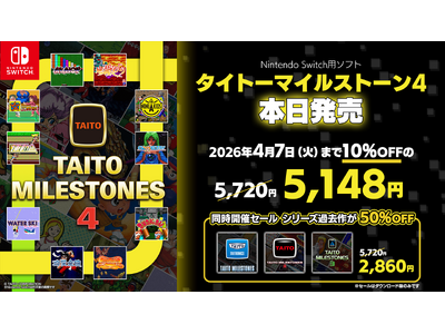 株式会社タイトー(本社:東京都新宿区、以下タイトー)は、Nintendo Switch(TM)用ソフト『タイトーマイルストーン4』を本日2026年3月26日(木)に発売したことをお知らせいたします。また、ダウンロード版は早期購入セールとして2026年4月7日(火)23時59分まで10%OFFでお買い求めいただけるほか、本作に加え『タイトーマイルストーン』シリーズ(ダウンロード版)を50%OFFでお買い求めいただけるセールも同期間開催中です。この機会にぜひお楽しみください。