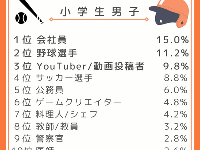 ◆男子のランキングで「野球選手」が第2位! 小学生男子では、前回「サッカー選手」を上回った「野球選手」が、今回「YouTuber/動画投稿者」をも逆転し2位にランクインしました!応援するチームの試合やWBCを観戦して、大谷翔平選手をはじめ国内外問わず活躍するプロ野球選手への憧れを理由に挙げる人が多く、スター選手の活躍が子どもたちの夢を強く後押ししているようです。 一方で、6年連続で1位をキープしている「会社員」を選んだ理由を聞いたところ、お父さん・お母さんの働く背中を見て育っていることが大きな影響を与えているとわかりました。スーツ姿で出勤する日々、パソコンに向かって仕事をする様子、家族の生活を支えるために働く姿を身近に感じる中で、職種そのものへの憧れというより、「働く大人」への信頼感が育まれ、「会社員」という選択につながっていると考えられます。 小学生女子では、「パティシエ」が6連覇を達成し、「幼稚園の先生/保育士」が昨年の10位圏外から一転、第3位にランクイン。なりたい理由には、自身の体験に根ざした動機が目立ちました。「パティシエ」は、「家族や友達に食べてもらい、喜ぶ顔を見るのが嬉しい」など、「ものづくりの楽しさ」や「人を喜ばせる達成感」が志望理由の中心となっています。「幼稚園の先生/保育士」は、自分が幼稚園・保育園でお世話になった先生への憧れや実体験を理由に挙げている子が多く、どちらの職業も、「好き」「楽しい」「かわいい」といった感情が、将来像へと自然につながっている点が特徴です。
