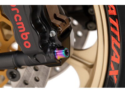 ブレンボラジアルキャリパーとフロントフォークを自然に繋ぐ滑らかなデザインカラーリングはオフセットカラー自体が目立たない半艶ブラックアルマイトを採用