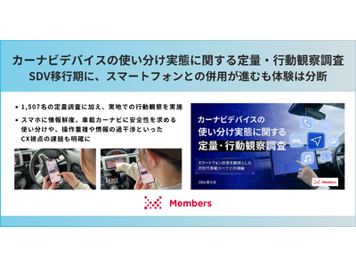 DX現場支援で顧客と共に社会変革をリードする株式会社メンバーズ(本社:東京都中央区、代表取締役社長:高野 明彦、東証プライム:2130、以下「メンバーズ」)は、「カーナビデバイスの使い分け実態に関する定量・行動観察調査」を実施しました。