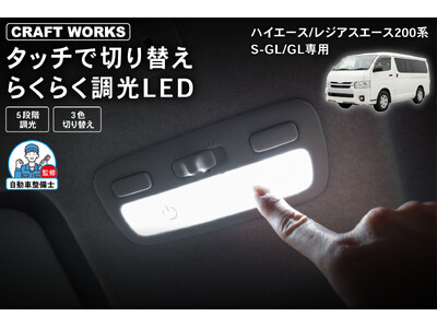 【新発売】ハイエース/レジアスエース 200系S-GL/GL専用 タッチ操作で簡単に切り替えできる調光LEDルームランプを発売。3色の色味と5段階の明るさをワンタッチで自在に調整、車内空間を快適に演出