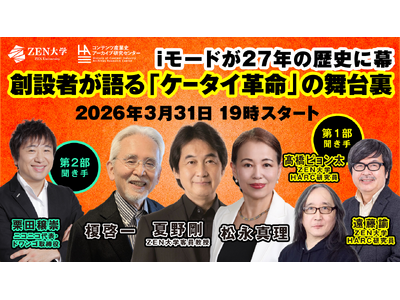 ZEN大学 コンテンツ産業史アーカイブ研究センター(HARC)は、株式会社NTTドコモの「iモード(R)」サービスが終了を迎える2026年3月31日(火)、サービス創設の中核を担った松永真理氏、榎啓一氏と、本学の夏野剛客員教授による公開収録を実施いたします 。