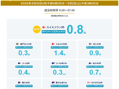 ※3「業界最狭水準スプレッドキャンペーン」スプレッド(対象期間:2026年3月30日(月)午前9時00分~2026年5月2日(土)午前3時00分、掲示時間帯:対象期間中の各営業日午前9時~翌午前3時)。左記以外の時間帯のスプレッドは次の通りです。スイスフラン/円:1.8~25.0銭、南アフリカランド/円:0.9~6.0銭、トルコリラ/円:1.7~6.0銭、ポンド/円:0.9~15.0銭、ユーロ/円:0.5~10.0銭、ユーロ/米ドル:0.4~8.0pips、NZドル/円:1.2~10.0銭、豪ドル/円0.7~10.0銭、豪ドル/米ドル:0.9~6.0pips、カナダドル/円:1.7~10.0銭