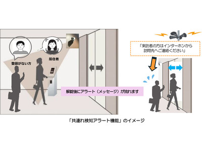この実証実験は、居住者がエントランスのオートロックを解錠して入館する際、顔認証登録のない方が連れ立って一緒に入館しようとすると、直ちにシステムがそれを検知してエントランスにアラートを発し、入館する居住者に気づきを与えるものです。これにより、見知らぬ人がついてきた場合は先を譲るほか、エレベーター内で非常ボタンをすぐに押せる位置に立つなど、当該の居住者に意識と対策を促すことでマンションのセキュリティ強化につなげようとするものです。