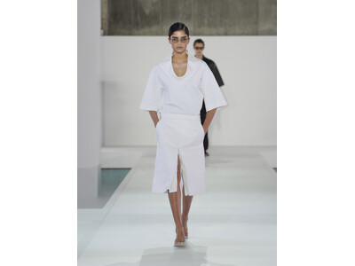 素材への探求は、今シーズンの立体感をさらに際立たせています。レザーやテクニカル素材はほのかな光沢を帯び、意図されたドレープや彫刻的なフォルムを強調。紙のような質感はしわ感のある触覚的な表情をもたらし、リネンのメランジがテクスチャーに奥行きを加えています。ランウェイでは、透け感のある素材が動きの中で身体をほのかに映し出し、軽やかなファブリックが自然に揺れることで、静かな洗練さを感じさせるムードを強調しました。