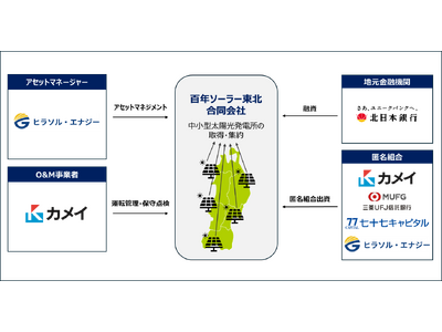 カメイ株式会社(本社:宮城県仙台市、代表取締役社長:亀井 昭男、以下「カメイ」)、三菱UFJ信託銀行株式会社(本社:東京都千代田区、取締役社長:窪田 博、以下「三菱UFJ信託銀行」)、七十七キャピタル株式会社(本社:宮城県仙台市、取締役社長: 今野 晃 )が運営する77ストラテジック・インベストメント第2号投資事業有限責任組合(以下「七十七キャピタル」)、ヒラソル・エナジー株式会社(本社:東京都文京区、代表取締役:李 旻、以下「ヒラソル・エナジー」)は、東北エリアの太陽光発電所を取り巻く廃棄・放棄課題の解決と長期安定稼働による脱炭素化を推進するために、「百年ソーラー東北合同会社(以下「百年ソーラー東北」)」と匿名組合契約を締結し、百年ソーラー東北は株式会社北日本銀行(本店:岩手県盛岡市、取締役頭取:石塚 恭路、以下「北日本銀行」)とプロジェクトファイナンス契約を締結いたしました。