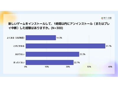 新しいゲームをインストール後、1時間以内にアンインストールまたはプレイを中断した経験については、「よくある(14.3%)」「ときどきある(37.7%)」を合わせて52.0%と半数を超えました。