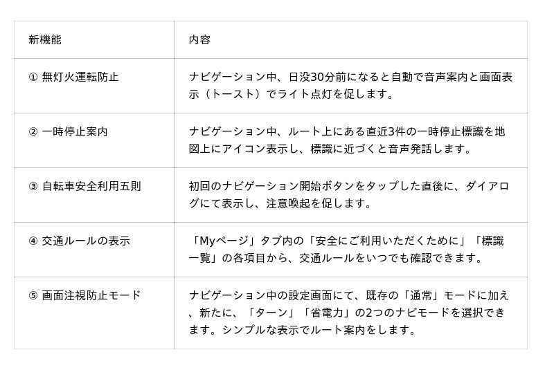 今後も『自転車NAVITIME』は、ユーザーが安心安全に利用できるサービスの提供に努めるとともに、安全な自転車運転の促進や、交通事故削減に貢献できればと考えております。