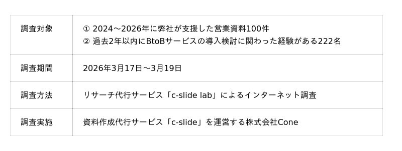 株式会社Cone(本社:大阪府大阪市、代表取締役:佐藤 立樹)は、2024~2026年に支援した営業資料100件のスライド項目分析と、過去2年以内にBtoBサービスの導入検討に関わった顧客側222名へのアンケートを実施しました。