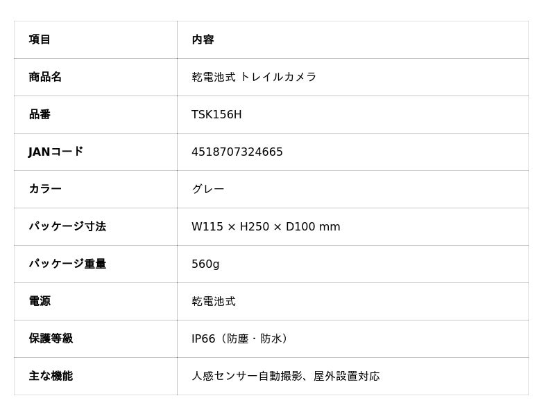 本製品は、乾電池駆動、IP66防塵・防水仕様、夜間撮影(モノクロ)、人感センサーによる自動撮影など、屋外設置に求められる性能をコンパクトにまとめたモデルです。