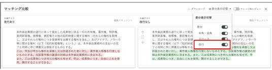 「LAWGUE」の差分表示において、「表示差分切替」タブより「半角・全角」「スペース」「改行」の「ON/OFF」を選択することで、目的に合わせたカスタマイズが可能です。
