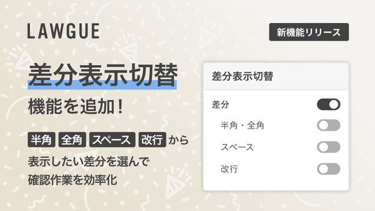 「LAWGUE」の差分表示では、これまでドキュメント内の全差分を検知し、ハイライトされる仕様となっていました。文章の内容に関する差分チェックに集中したいシーンでは、改行や半角・全角の違いなどの形式的な部分までも差分として可視化されてしまうと、効率よく確認作業を進める妨げになる場合があります。今回の「差分表示切替」機能の追加により、「半角・全角」「スペース」「改行」の検知を任意で選択でき、必要な差分だけを絞って確認できるようになります。