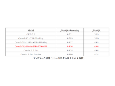 株式会社リコー(社長執行役員:大山 晃)は、経済産業省と国立研究開発法人新エネルギー・産業技術総合開発機構(NEDO)が実施する、国内における生成AIの開発力強化を目的としたプロジェクト「GENIAC(Generative AI Accelerator Challenge)*1」第3期において、図表を含む多様なドキュメントを、高精度に読み取ることができる、リーズニング性能*2を備えたマルチモーダル大規模言語モデル(以下、リーズニングLMM)の基本モデル「Qwen3-VL-Ricoh-32B-20260227」の開発を完了したことをお知らせします。本モデルは、多段推論を通じて複雑なドキュメントを理解できる点が特徴です。