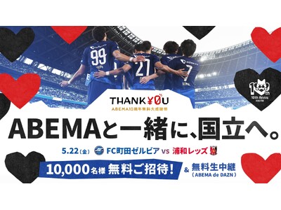 新しい未来のテレビ「ABEMA(アベマ)」は、2026年4月に迎える開局10周年を記念した「ABEMA10周年無料大感謝祭」の第2弾として、2026年5月22日(金)にMUFGスタジアム(国立競技場)にて開催される『FC町田ゼルビア vs 浦和レッズ』の試合に、10,000名様を無料招待することをお知らせいたします。また、本試合を「ABEMA de DAZN」にて無料生中継することも決定いたしました。