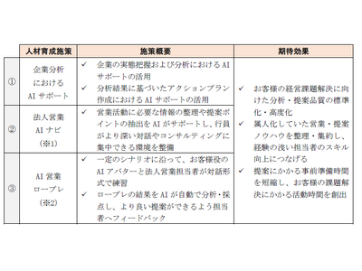 「企業分析におけるAI サポート」、「法人営業AI ナビ」、「AI 営業ロープレ」の3 つの人材育成施策を本格展開していく予定です。