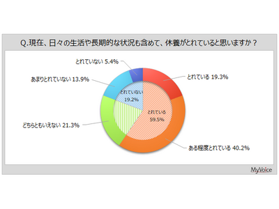 休養がとれている人は6割弱、とれていない人は2割弱。休養時の過ごし方は「睡眠をとる、昼寝、仮眠」が6割弱、「何もせずにゆっくり過ごす」が5割弱、「テレビ、動画、SNS、ゲーム」が3割強