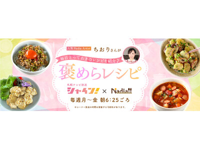 札幌テレビ放送で新たに始まった朝の情報番組「シャイン!」(毎週月~金 朝5:00~6:54)。その中で、人気Nadia Artistのちおりさんによる新コーナー「褒めらレシピ」が始まりました! ちおりさんが家族に喜ばれるとっておきのレシピを紹介します。