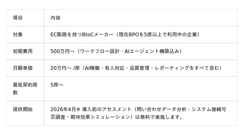 本サービスは、生成AIチャットボット・電話応対AI・事務処理AIの3つのAIエージェントと、業界水準の2倍にあたる時給3,000円クラスの専門人材を組み合わせたハイブリッド型BPOです。1席あたり月額20万円~ と、従来BPO(席単価40~60万円)の半額以下を実現しながら、EC特有の問い合わせ(配送状況・返品手続き・在庫照会など)の約7割をAIが自動処理します。