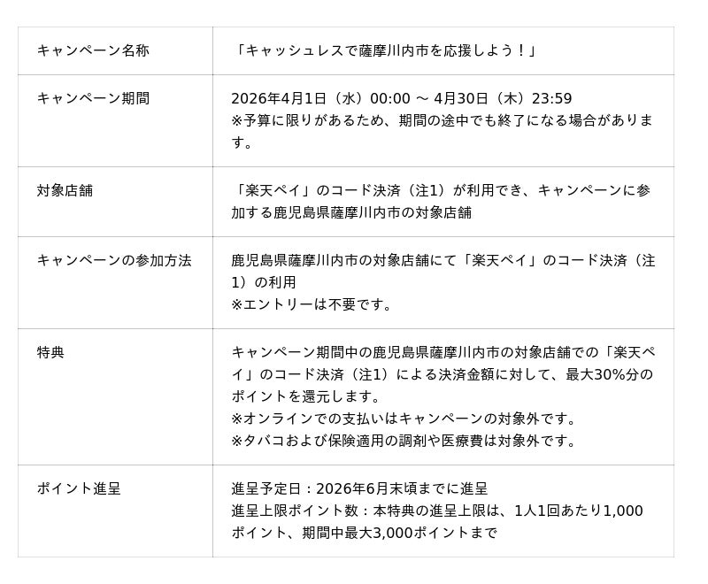 楽天ペイメント株式会社(以下「楽天ペイメント」)は、運営するキャッシュレス決済サービス「楽天ペイ」において、鹿児島県薩摩川内市が2026年4月1日(水)から4月30日(木)まで実施する「キャッシュレスで薩摩川内市を応援しよう!」キャンペーンに参加することをお知らせします。