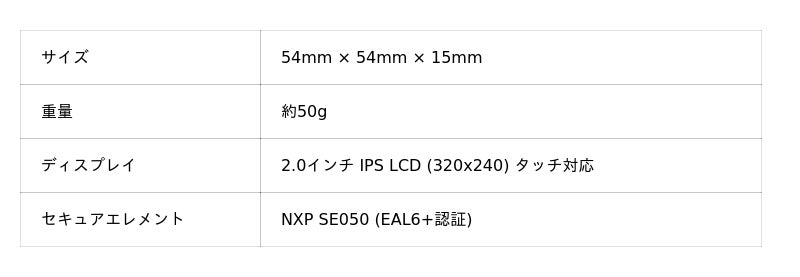 タッチスクリーン、バッテリー駆動、音声による操作フィードバックなど、個人ユーザーや企業ユーザーにも扱いやすい設計となっています。Air Gap(QRコード)・USB・Bluetoothの3つの接続方式に対応し、セキュリティポリシーに応じた柔軟な運用が可能です。