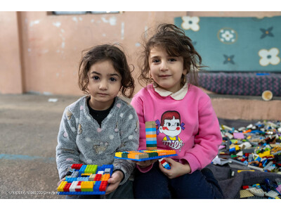 ベイルートの学校で避難生活を送る3歳のナージェスちゃん(左)と4歳のマリカちゃん(右)。子どもたちがわずかな時間でも日常を取り戻せるよう、ユニセフはおもちゃを提供している(レバノン、2026年3月17日撮影) (C) UNICEF/UNI965200/Choufany