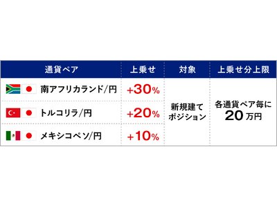 SBI FXトレード株式会社(本社:東京都港区、代表取締役社長:藤田 行生)は、本日より南アフリカランド/円(ZAR/JPY)・トルコリラ/円(TRY/JPY)・メキシコペソ/円(MXN/JPY)おいて、新規建てしたポジションを対象に受取りスワップポイントに上乗せして、キャッシュバックするキャンペーンを開催いたします。増額率は、南アフリカランド/円で30%、トルコリラ/円で20%、メキシコペソ/円で10%となります。