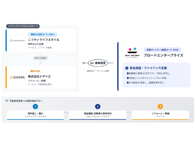 国内最大級の不動産物件情報検索プラットフォーム「ニフティ不動産」を提供するニフティライフスタイル株式会社(本社:東京都中野区、代表取締役社長:成田 隆志、証券コード:4262、以下「当社」)は、当社の連結子会社である株式会社ドアーズ(本社:東京都港区、代表取締役社長:輿石 雅志、以下「ドアーズ」)及び、不動産設備・リノベーションの分割払いフィナンシャルスキームを提供する株式会社ブロードエンタープライズ(本社:大阪府大阪市、代表取締役社長:中西 良祐、証券コード:4415、以下「ブロードエンタープライズ」)と協業し、不動産投資家向けに3社協業のもと、物件選定から購入後の改修(リフォーム/修繕) とその資金調達までをワンストップで支援する体制を構築することをお知らせいたします。