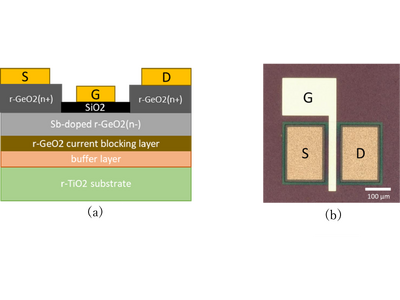 図1:r-GeO2 MOSFETの(a)断面模式図と(b)光学顕微鏡像