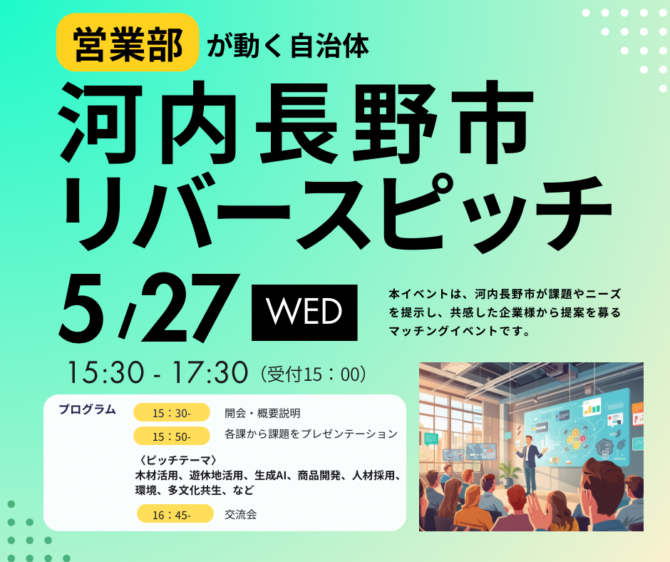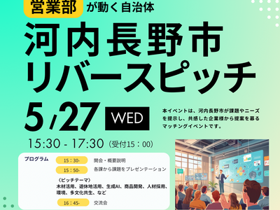 本イベントは、市が企業に対して課題を提示する「リバースピッチ」形式により、河内長野市をフィールドとした実証や事業連携の可能性を広く探り、新たな公民連携のきっかけを創出することを目的として開催します。