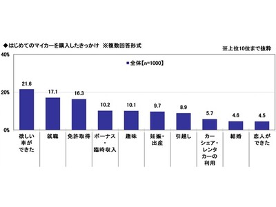 はじめてのマイカーを3年以内に購入した18歳~39歳の男女1,000名に、はじめてのマイカーを購入したきっかけを聞いたところ、「欲しい車ができた」(21.6%)が最も多くなり、次いで「就職」(17.1%)、「免許取得」(16.3%)、「ボーナス・臨時収入」(10.2%)、「趣味」(10.1%)となりました。