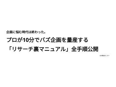 株式会社日本動画センター(代表取締役:山口直也)は、最新のAI技術を活用してYouTubeの企画立案時間を劇的に短縮するノウハウをまとめた資料『プロが10分でバズ企画を量産する「リサーチ裏マニュアル」』を無料公開しました。