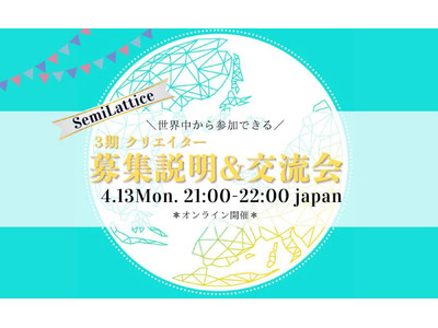 自分の強みとワクワクを軸に、世界中の仲間とチャレンジができるグローバル共創コミュニティ「SemiLattice」は、2025年2月で活動から1年を迎え、15か国、約60人の才能とつながることで、さまざまな活動をしてまいりました。このたび、3期クリエイターを5月10日より迎えることが決定、4月13日(月)より3期クリエイターの募集を開始いたします。それに伴い、オンラインにて無料の説明会を開催します。