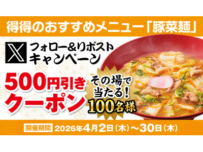 株式会社家族亭(本社:大阪府大阪市、代表取締役執行役員社長:音羽博之)が運営するうどんチェーン「得得(とくとく)」は、2026年4月2日(木)~4月30日(木)の期間、得得公式Xにて「得得デジタル500円引きクーポン」が抽選で100名様に当たる『Xフォロー&リポストキャンペーン』を開催いたします。