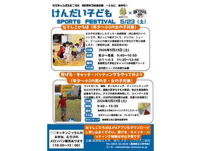 島根県立大学松江キャンパスでは、スポーツプラザ二協社(出雲市)と「"ともに、あゆむ80周年"コラボイベント」として「けんだい子どもSPORTS FESTIVAL」を開催します。子どもたちが目一杯体を動かし、運動が好きになるよう"県大なでしこ地域貢献サークル"の学生が指導者となりサポートします。