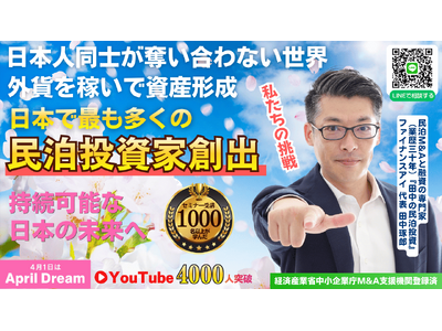 当社は、4月1日を夢を発信する日にしようとするApril Dreamに賛同しています。このプレスリリースは「株式会社ファイナスアイ(田中の民泊投資)」の夢です。