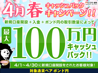 ヒロセ通商株式会社 (本社:大阪府西区、代表取締役:野市 裕作、以下:当社)は、当社の提供する「LION FX」において、2026年4月1日(水)より、「4月春最大100万円キャッシュバックキャンペーン!」を実施いたしましたのでお知らせいたします。
