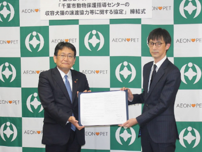 千葉市とイオンペットは、2022年11月に「千葉市動物保護指導センターの収容犬猫の譲渡協力等に関する協定」を締結しました。本協定の締結以降は、千葉市動物保護指導センターに収容された保護犬猫をイオンペットの譲渡型施設「ライフハウス」にて受け入れ、人慣れトレーニングの実施から新たな飼い主さまとの出会いに至るまでの譲渡活動を行うとともに、市民の皆さまへの適正飼育の普及啓発に官民連携のもと取り組んでいます。