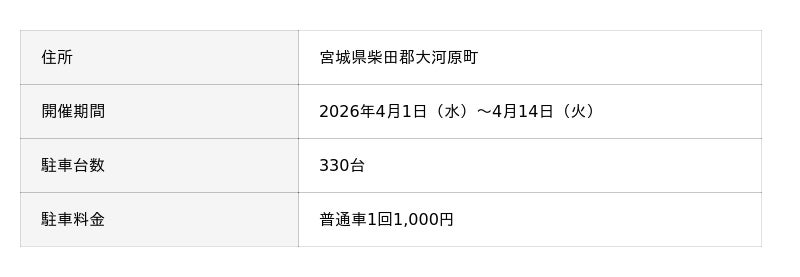 おおがわら桜まつり実行委員会(大河原町、大河原町商工会、(一社)大河原町観光物産協会)とタイムズ24株式会社(本社:東京都品川区、社長:西川 光一、以下「タイムズ24」)は、2026年4月1日から14日まで宮城県柴田郡大河原町で開催される「おおがわら桜まつり」の特設駐車場運営において、移動式駐車場管理サービス「タイムズパーキング キャラバン」を初めて導入します。