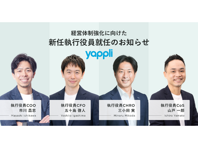 デジタルエクスペリエンスプラットフォーム「Yappli(ヤプリ)」を提供する株式会社ヤプリ(本社:東京都港区、代表取締役:庵原保文、以下「ヤプリ」)は、中長期的な企業価値向上と経営体制の強化を目的として、2026年4月1日付で新たに市川昌志(現 執行役員)が執行役員COO、五十島啓人が執行役員CFO、三小田実が執行役員CHROに就任することをお知らせいたします。なお、本体制強化に先立ち、2026年1月1日付で山戸一郎が執行役員CoSに就任しております。